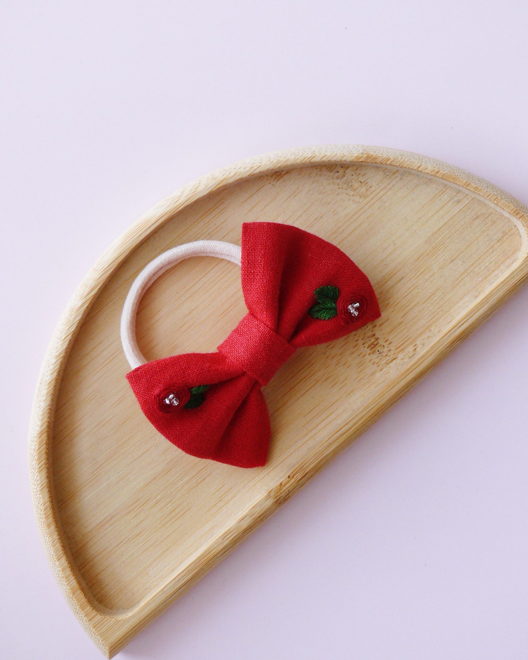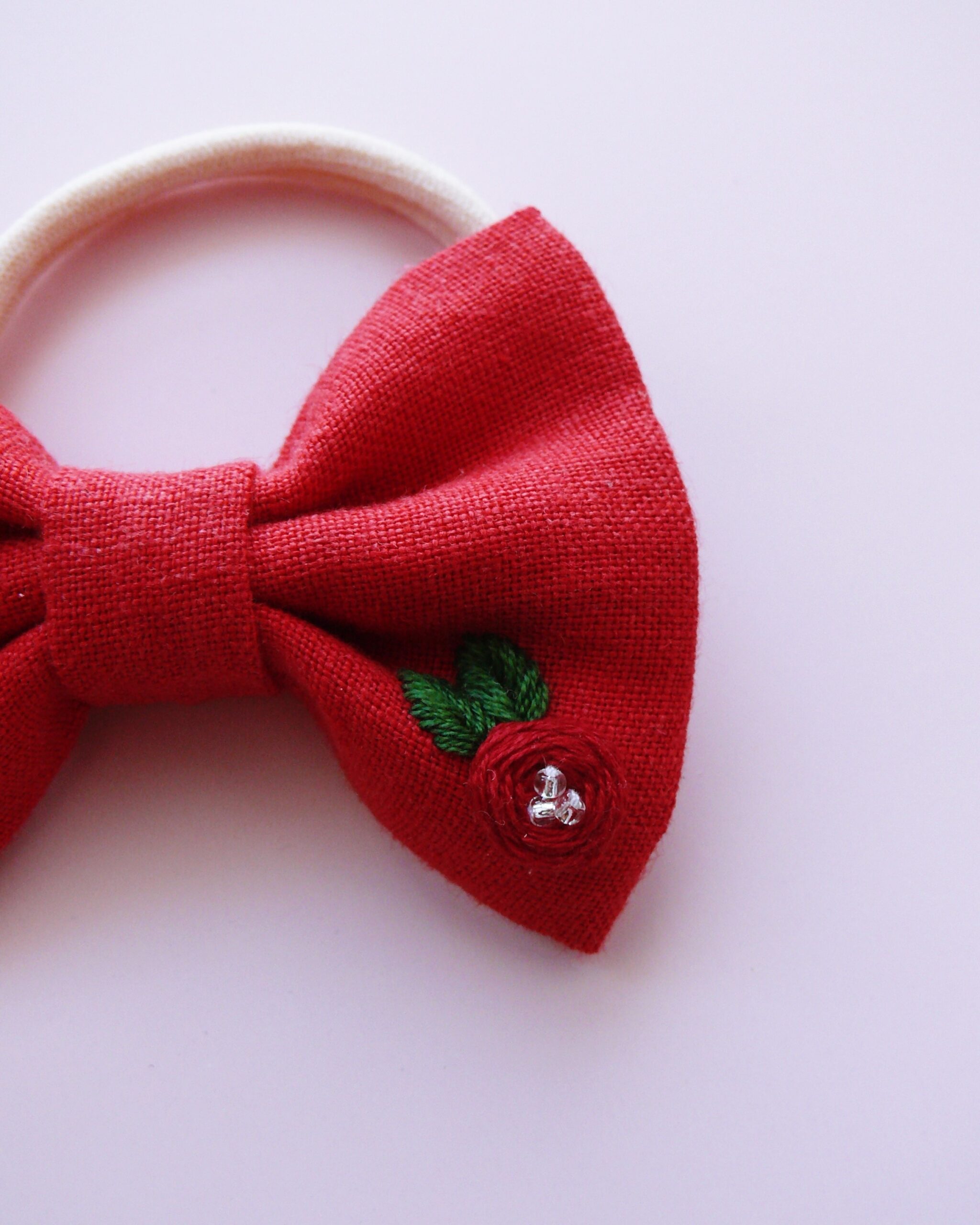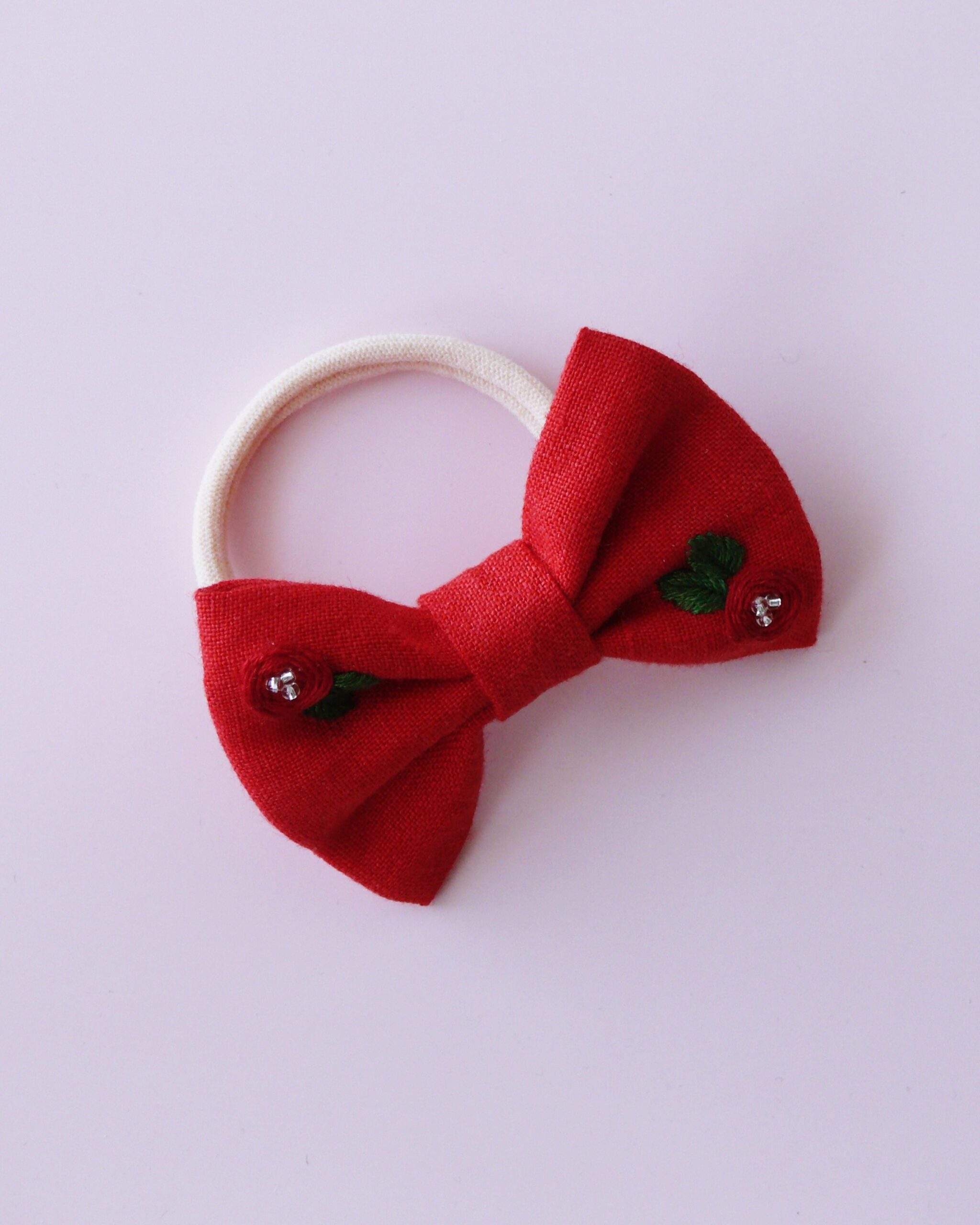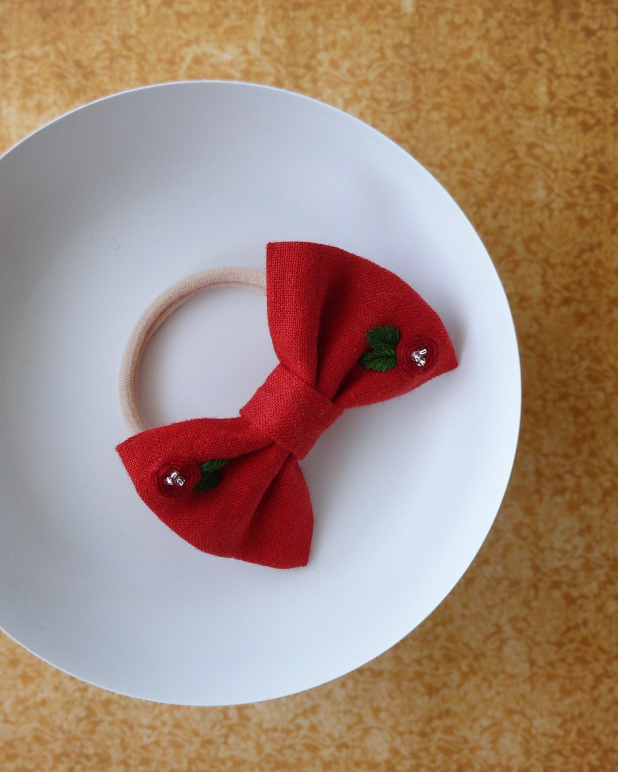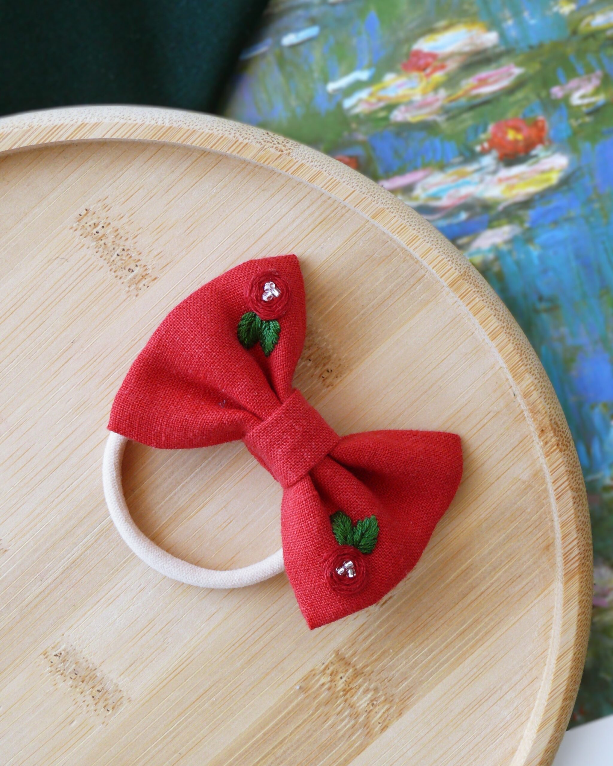 Gumka do włosów z lnianą kokardką czerwona z 100% lnu z certyfikatem OEKO-TEX, szyta w Polsce, ręcznie haftowana.