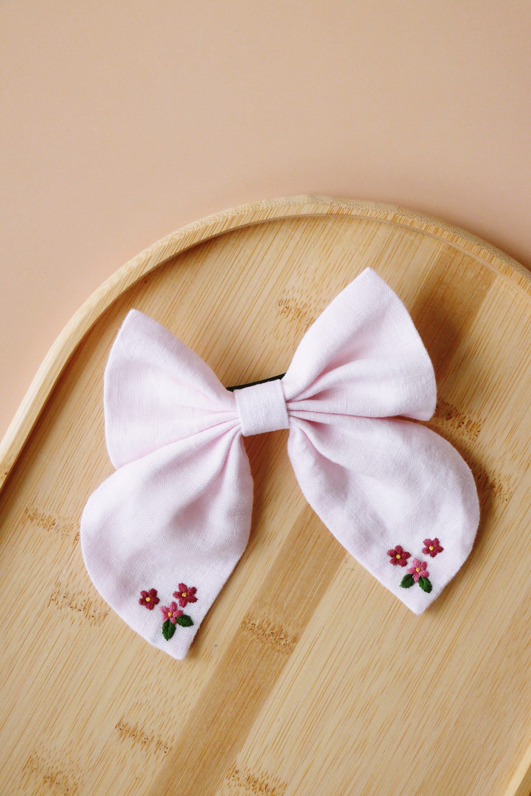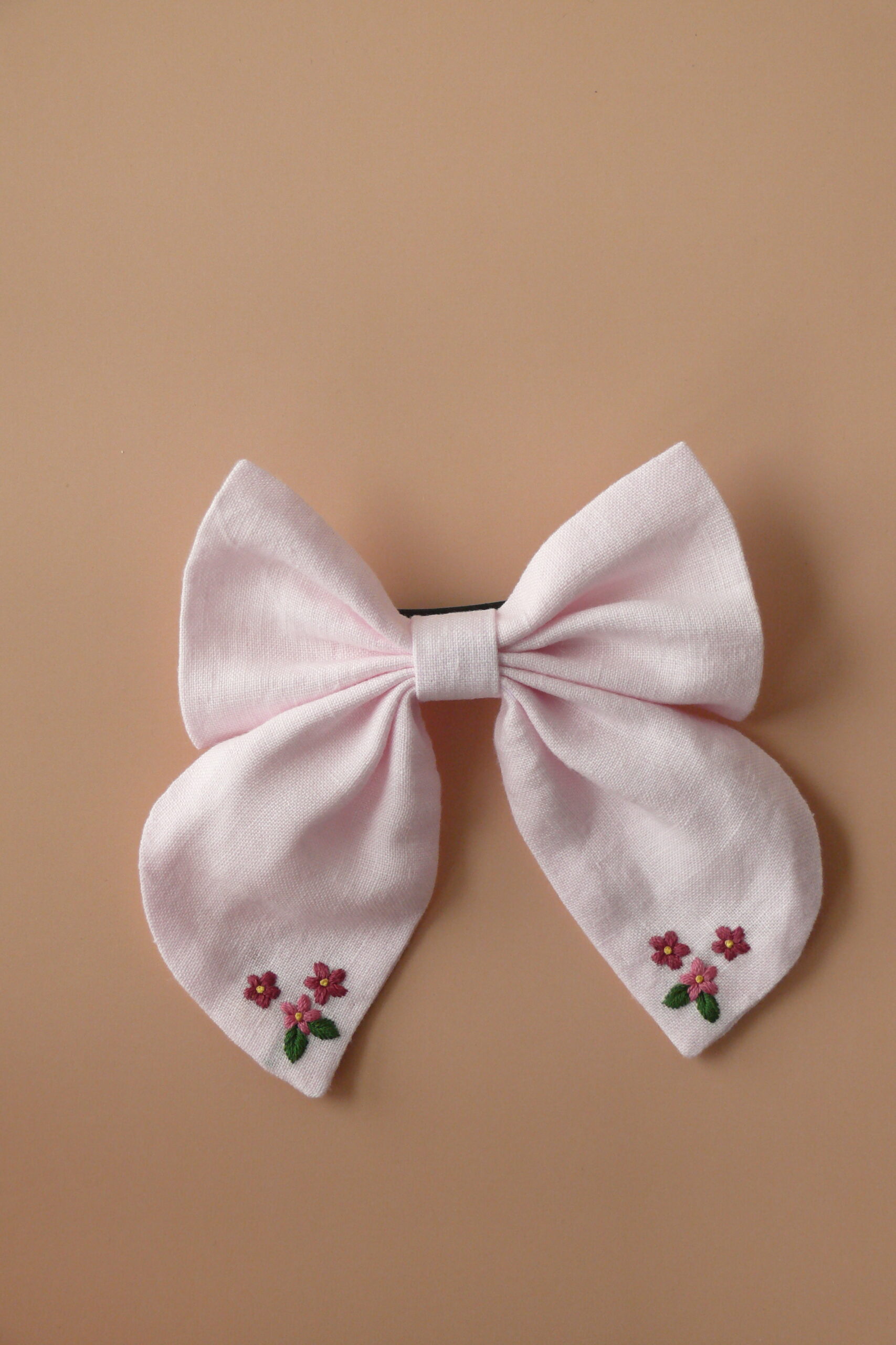 Haftowana kokarda dla dziewczynki to szyta w Polsce spinka do włosów z naturalnego, certyfikowanego lnu w kolorze różowym.