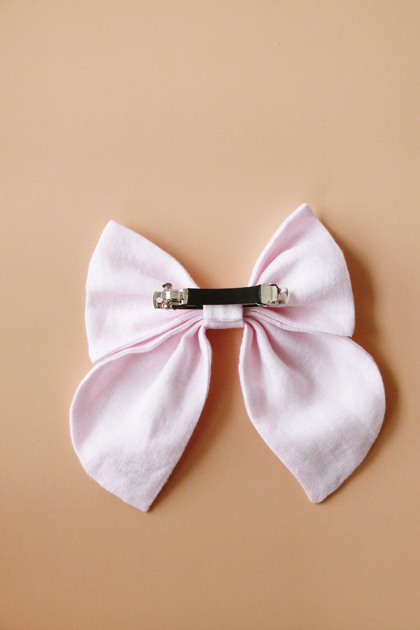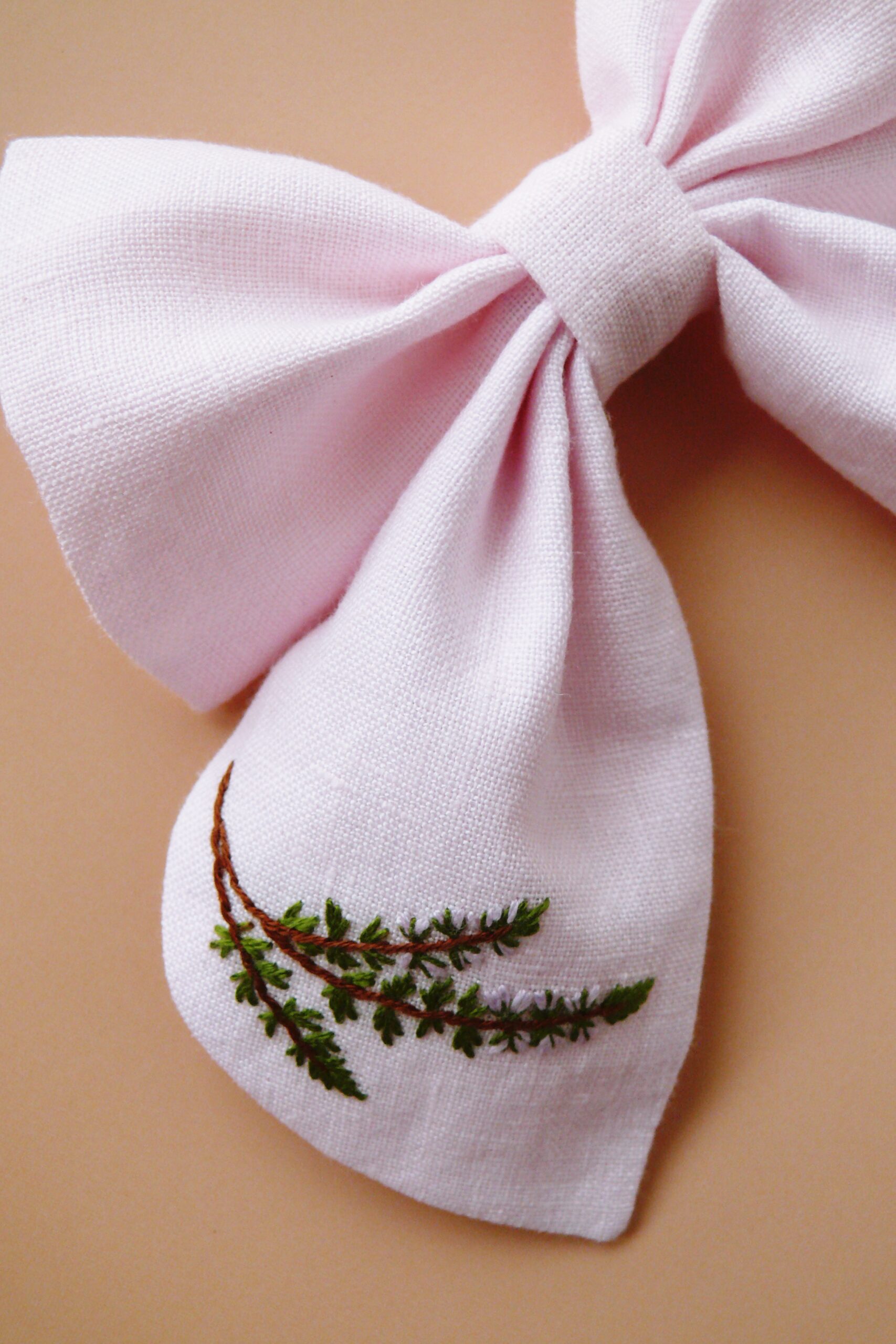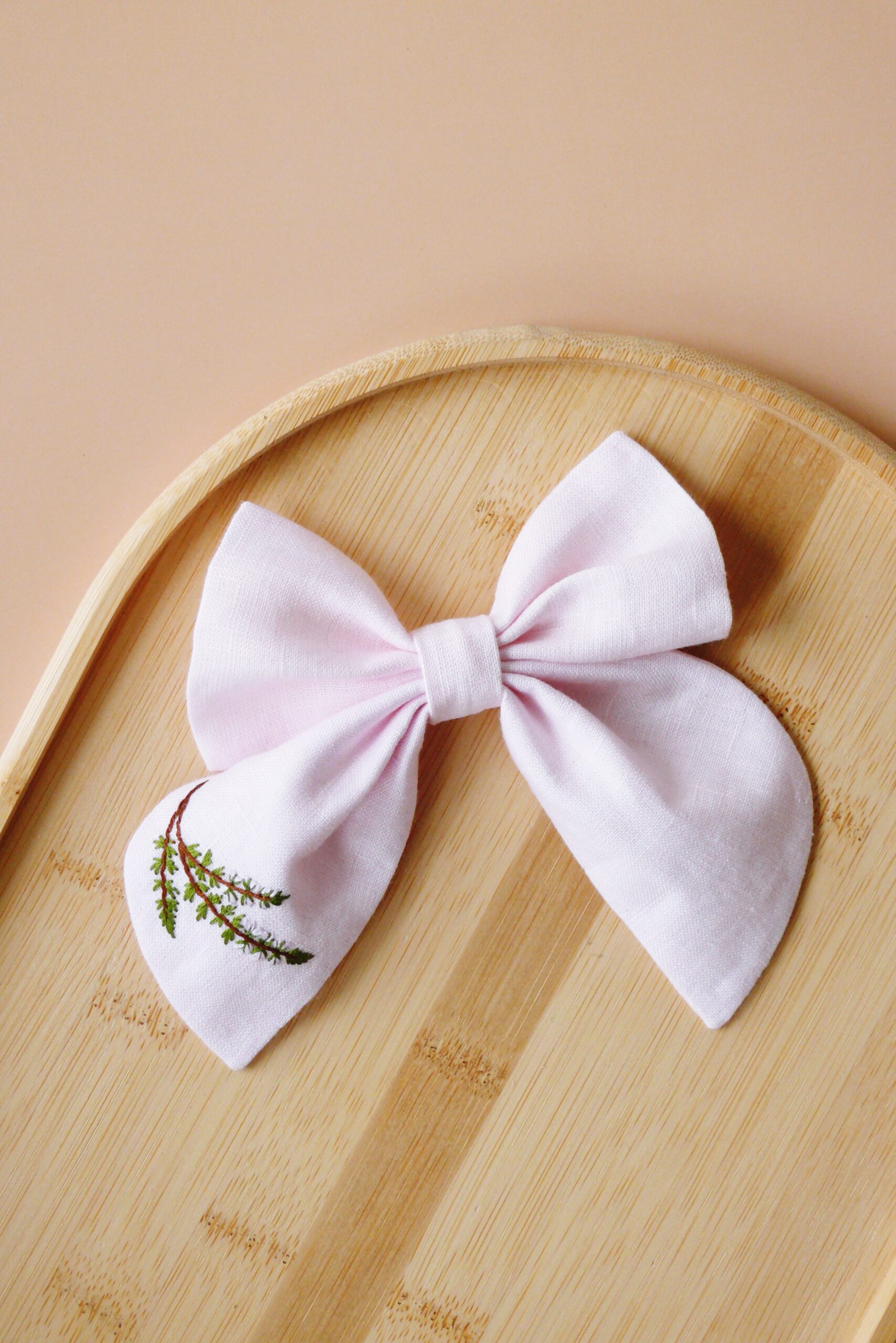 Haftowana kokarda dla dziewczynki to szyta w Polsce spinka do włosów z naturalnego, certyfikowanego lnu w kolorze różowym.