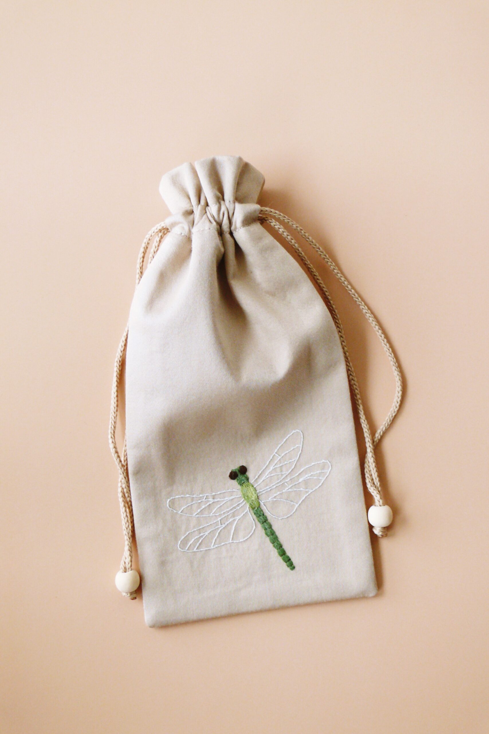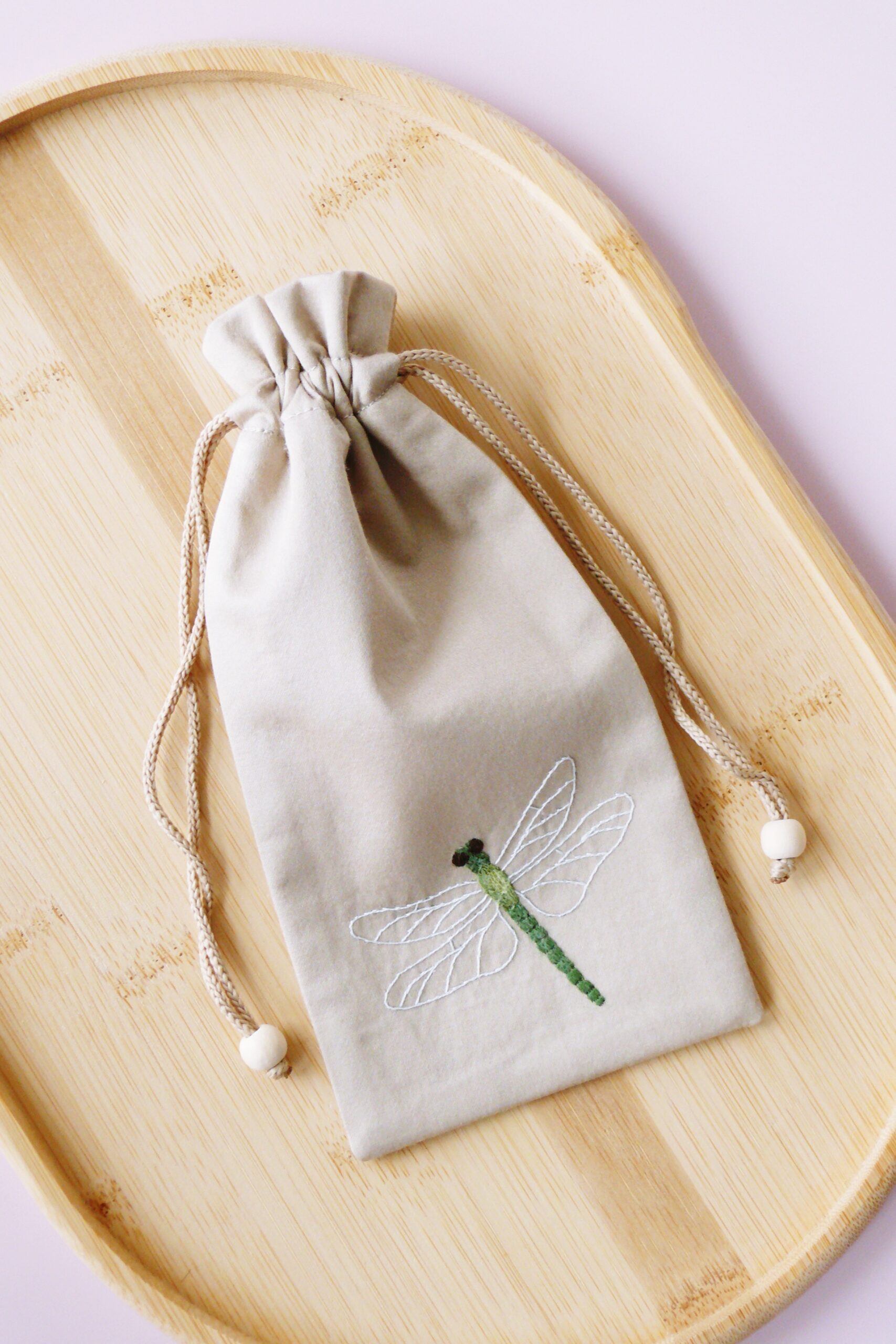 Woreczek na okulary to ręcznie haftowany drobiazg wykonany z certyfikowanej satyny bawełnianej w chłodnym odcieniu beżu. Zdobiony delikatnym haftem cieniowanym przedstawiającym ważkę i wykończony wewnątrz bawełnianą podszewką we wzór rumianków, ma wymiary ok 9,5 × 20 cm i jest ściągany u góry sznureczkiem.