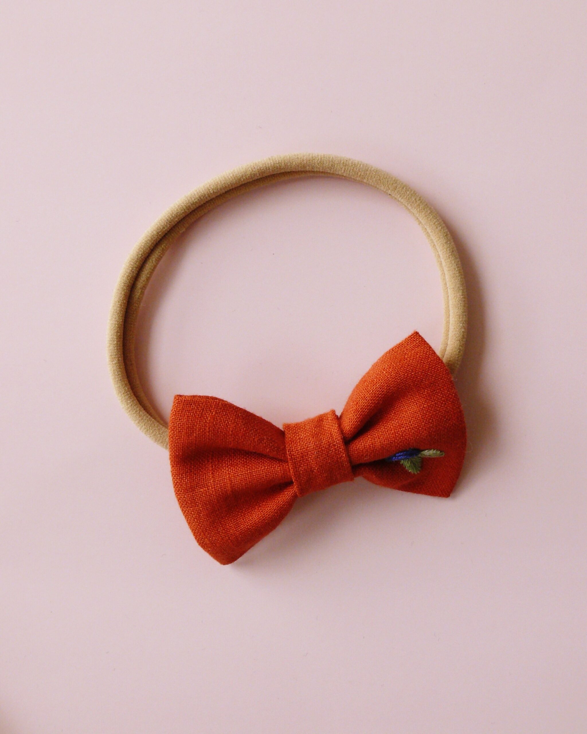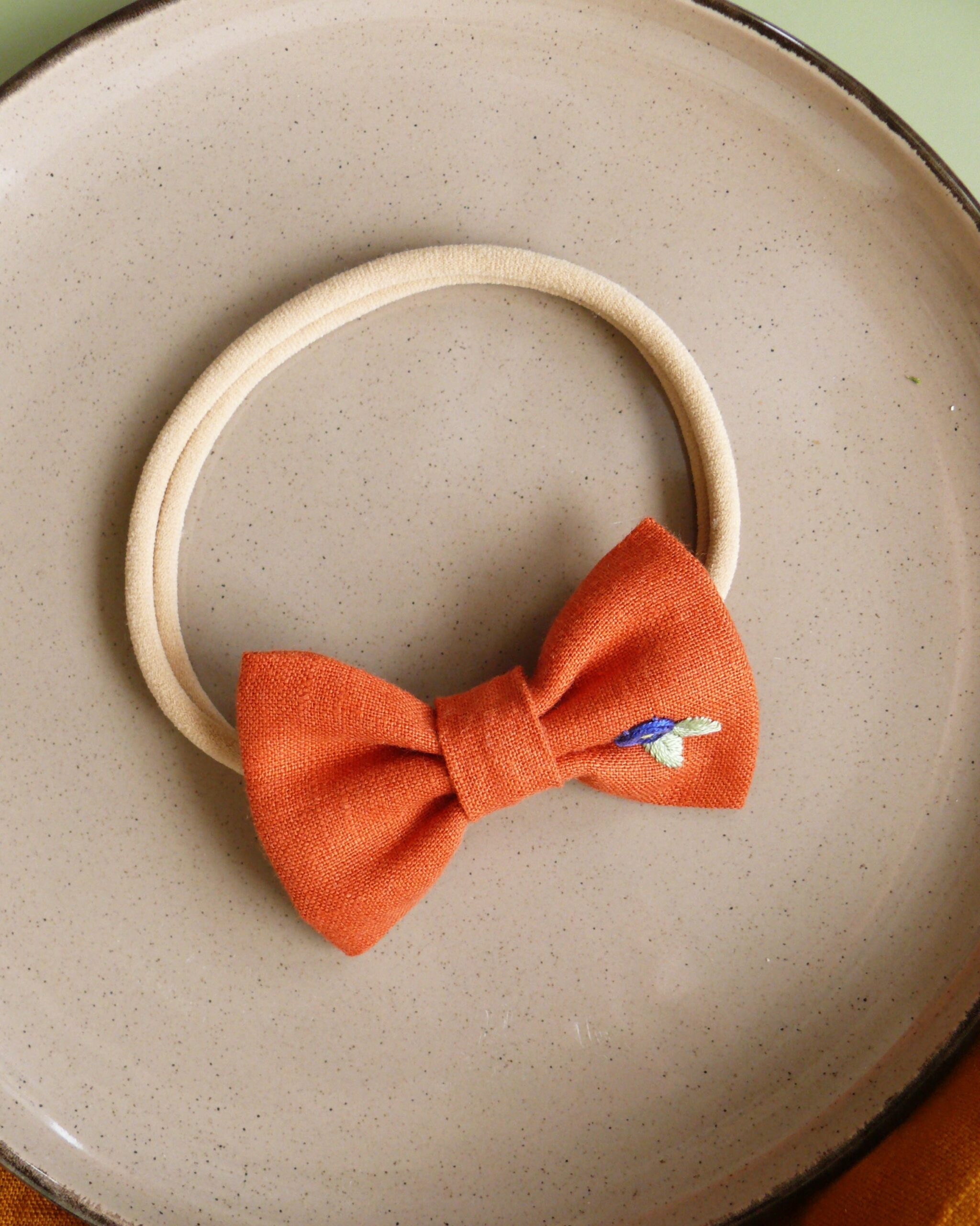 Opaska bezuciskowa do włosów z haftowaną kokardą z 100% lnu z certyfikatem OEKO-TEX, szyta w Polsce, ręcznie haftowana.