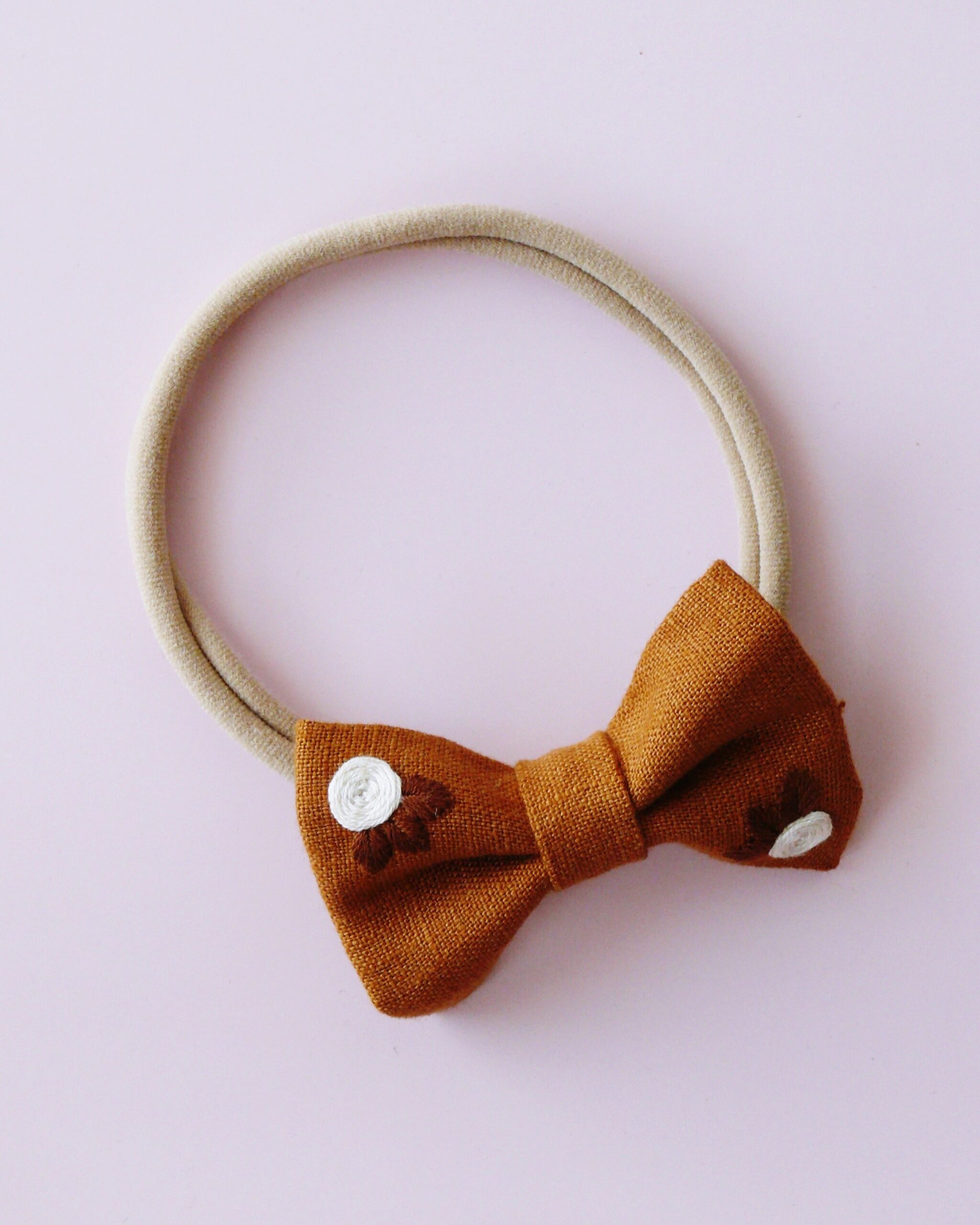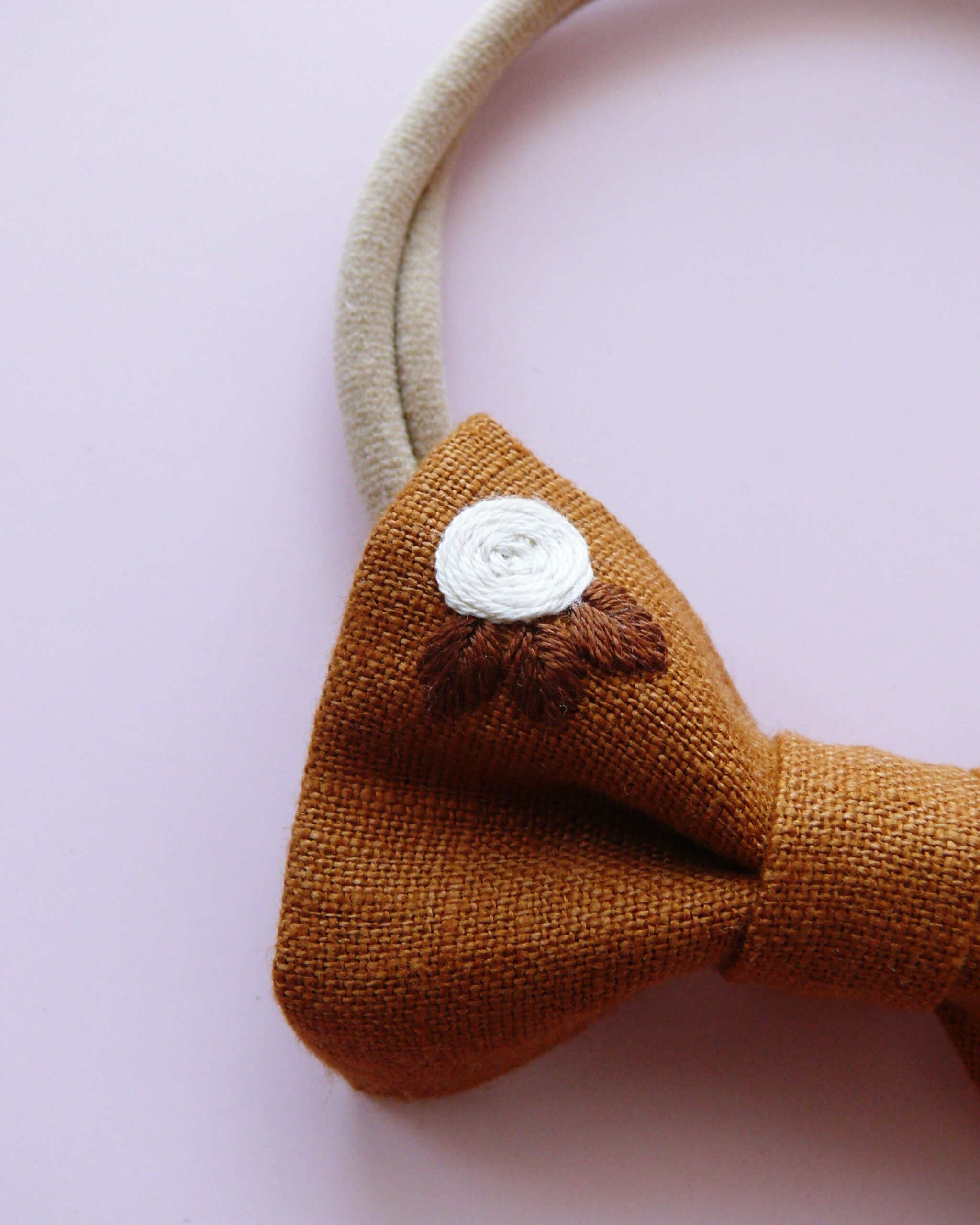 Opaska bezuciskowa do włosów z haftowaną kokardą z 100% lnu z certyfikatem OEKO-TEX, szyta w Polsce, ręcznie haftowana.