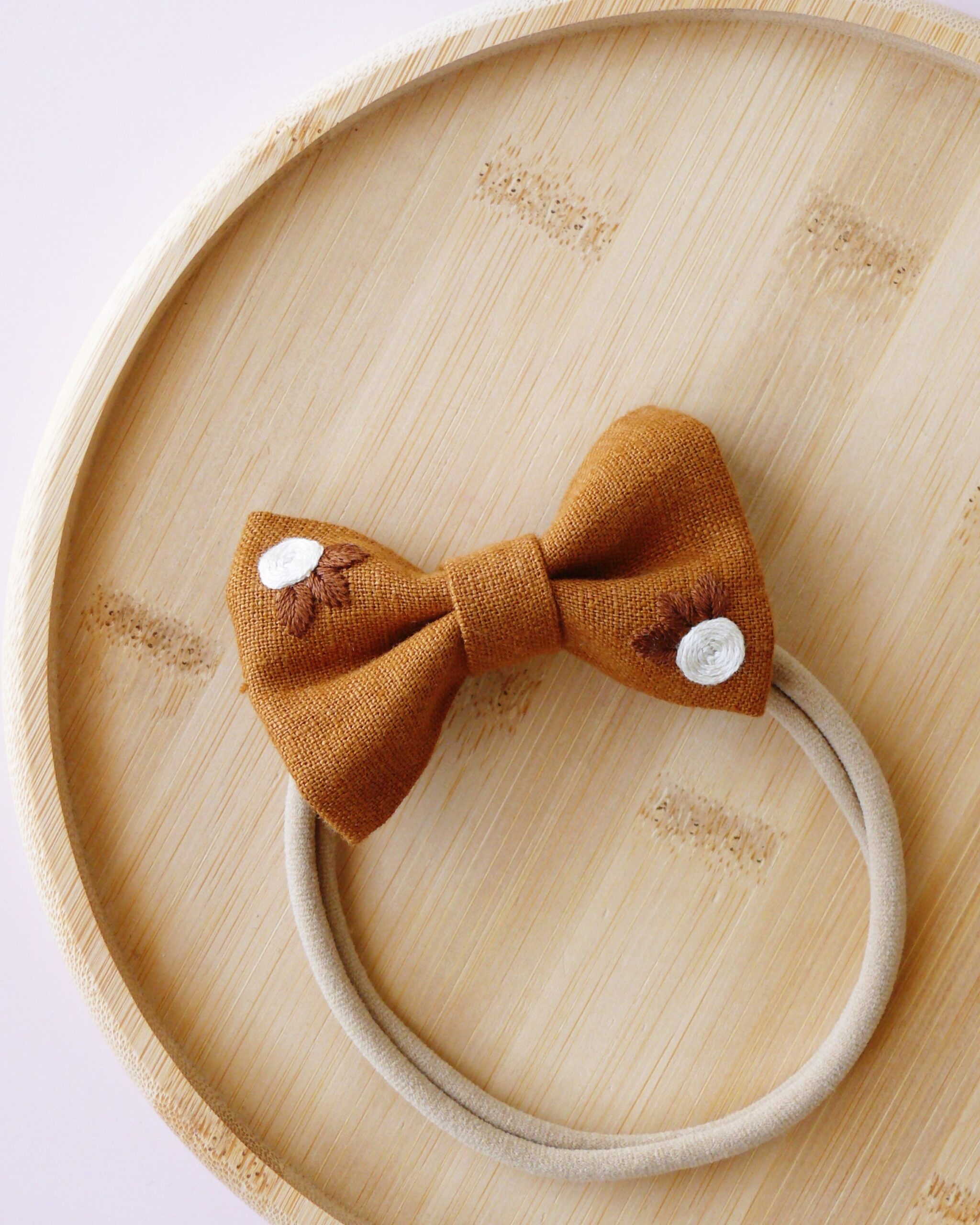 - ręczny haft — każdą kokardę haftuję ręcznie, dlatego wzór jest precyzyjny i trwały.