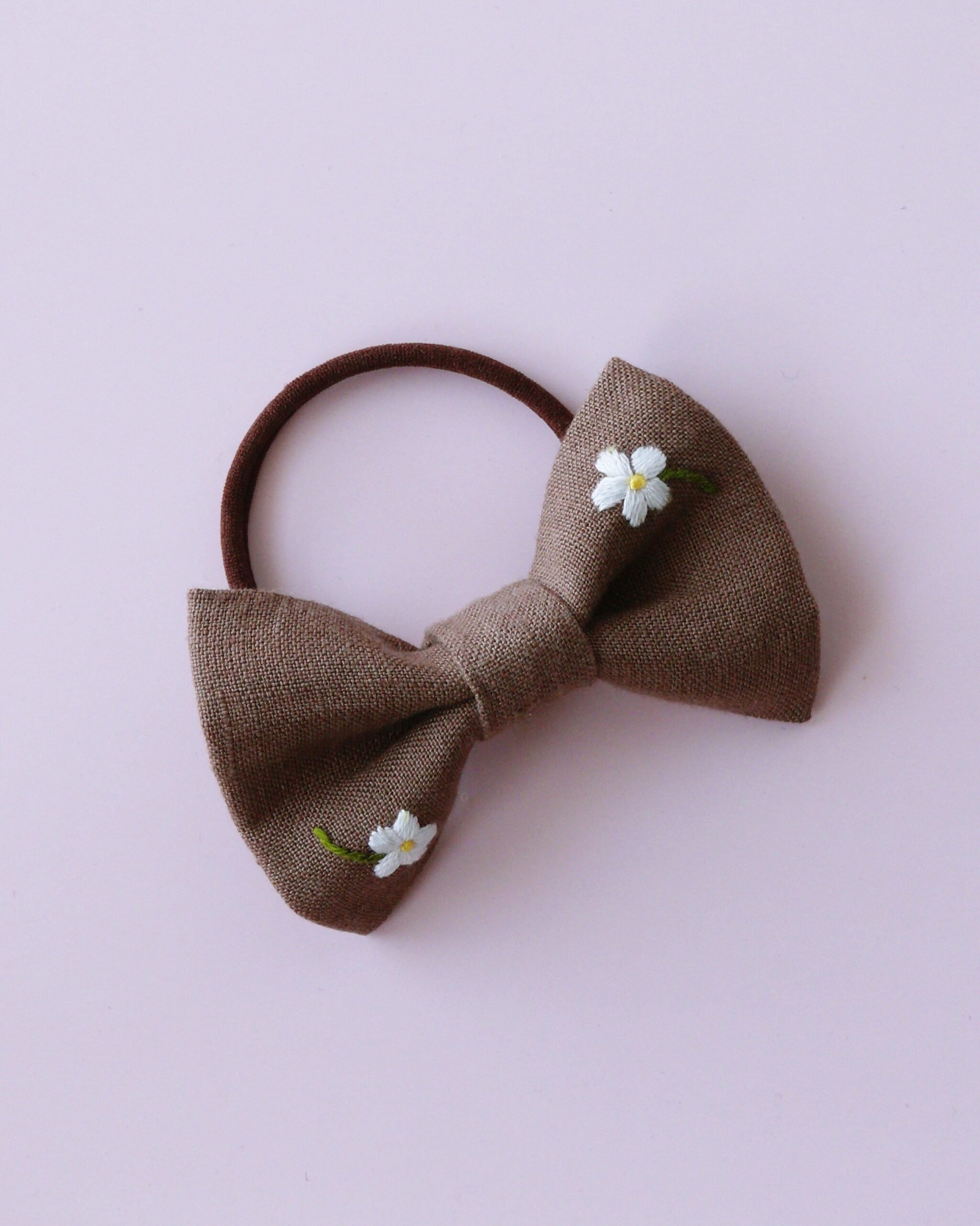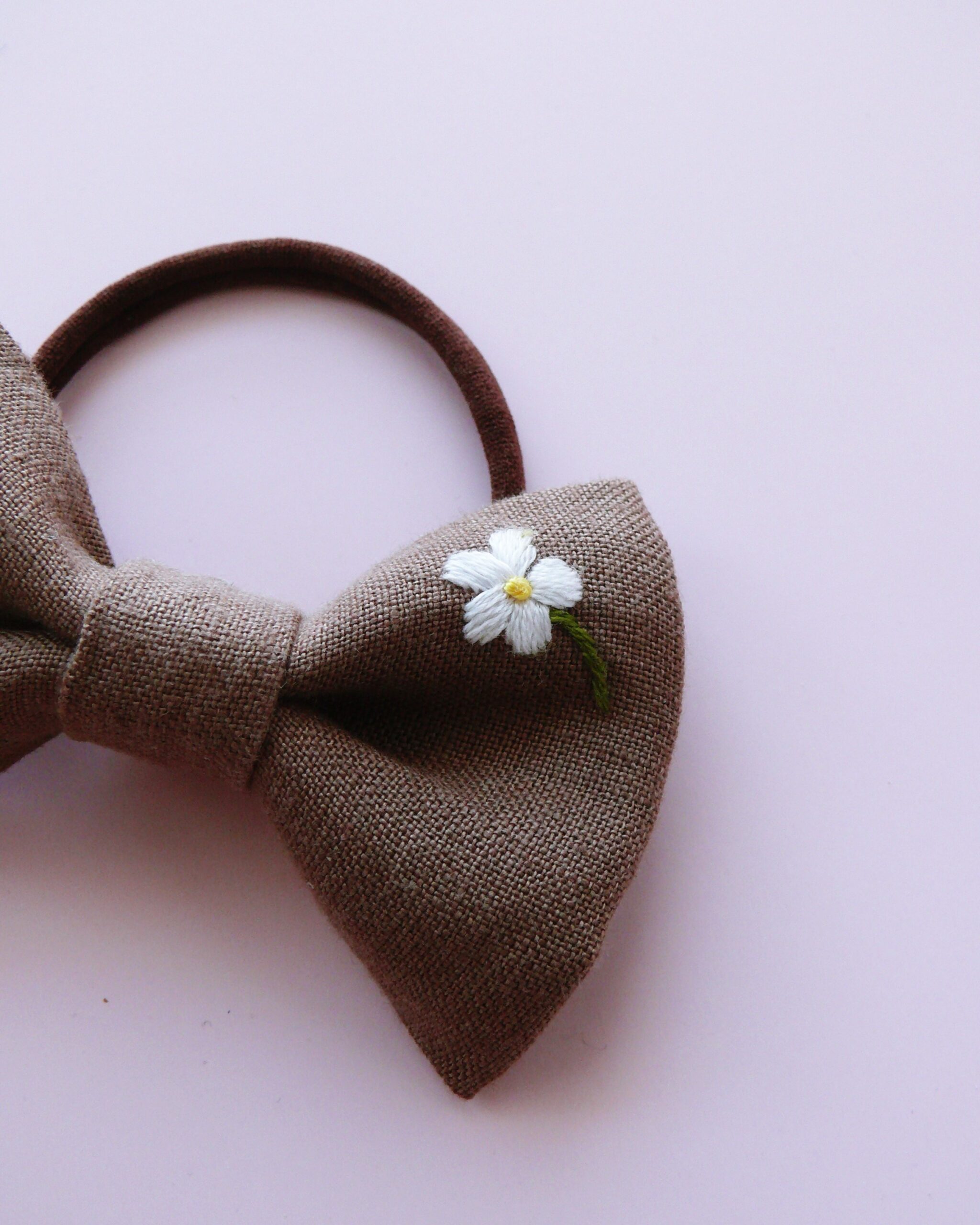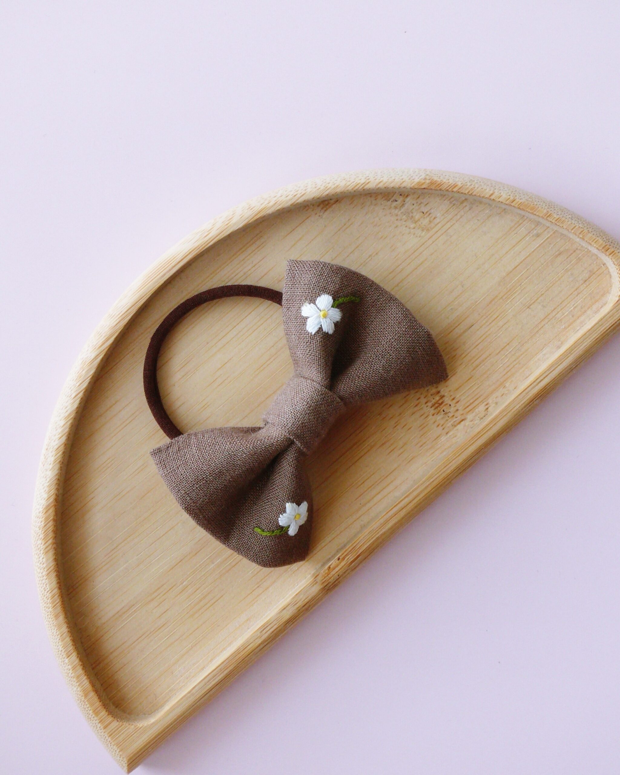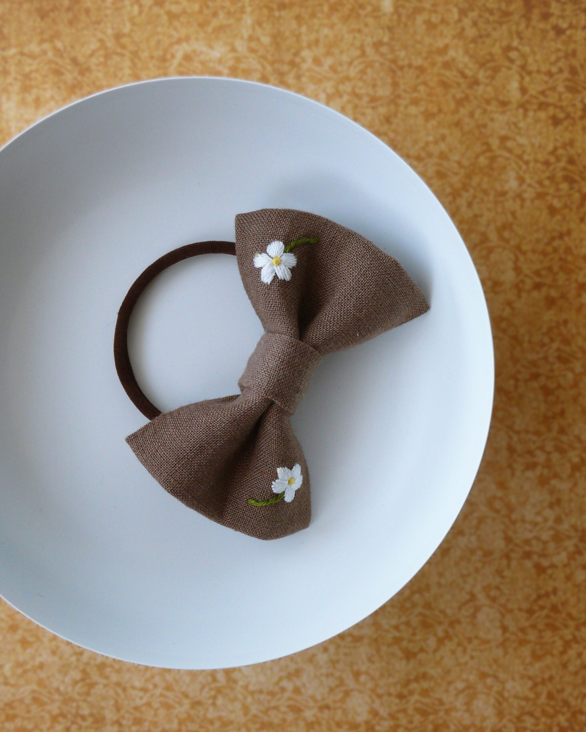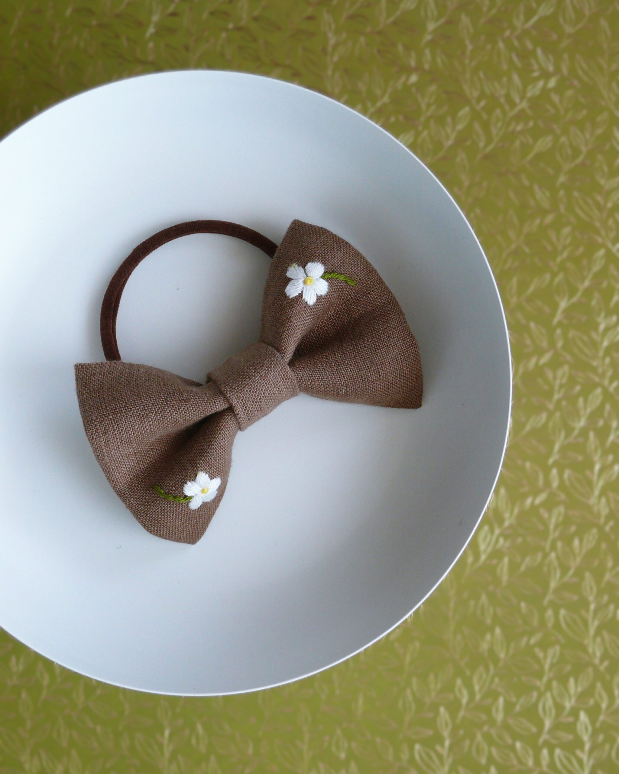 Gumka do włosów z lnianą kokardą brązową z 100% lnu z certyfikatem OEKO-TEX, szyta w Polsce, ręcznie haftowana.