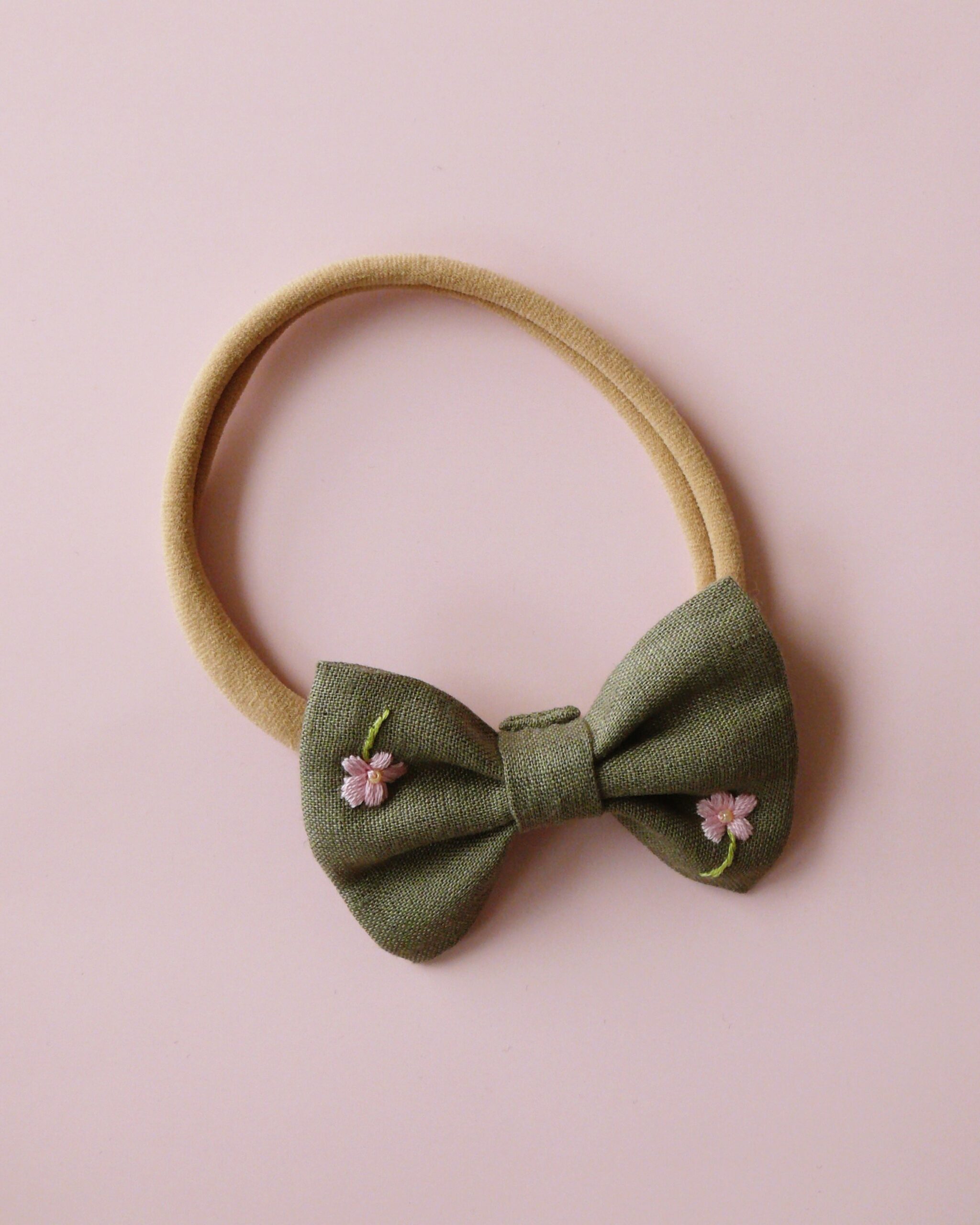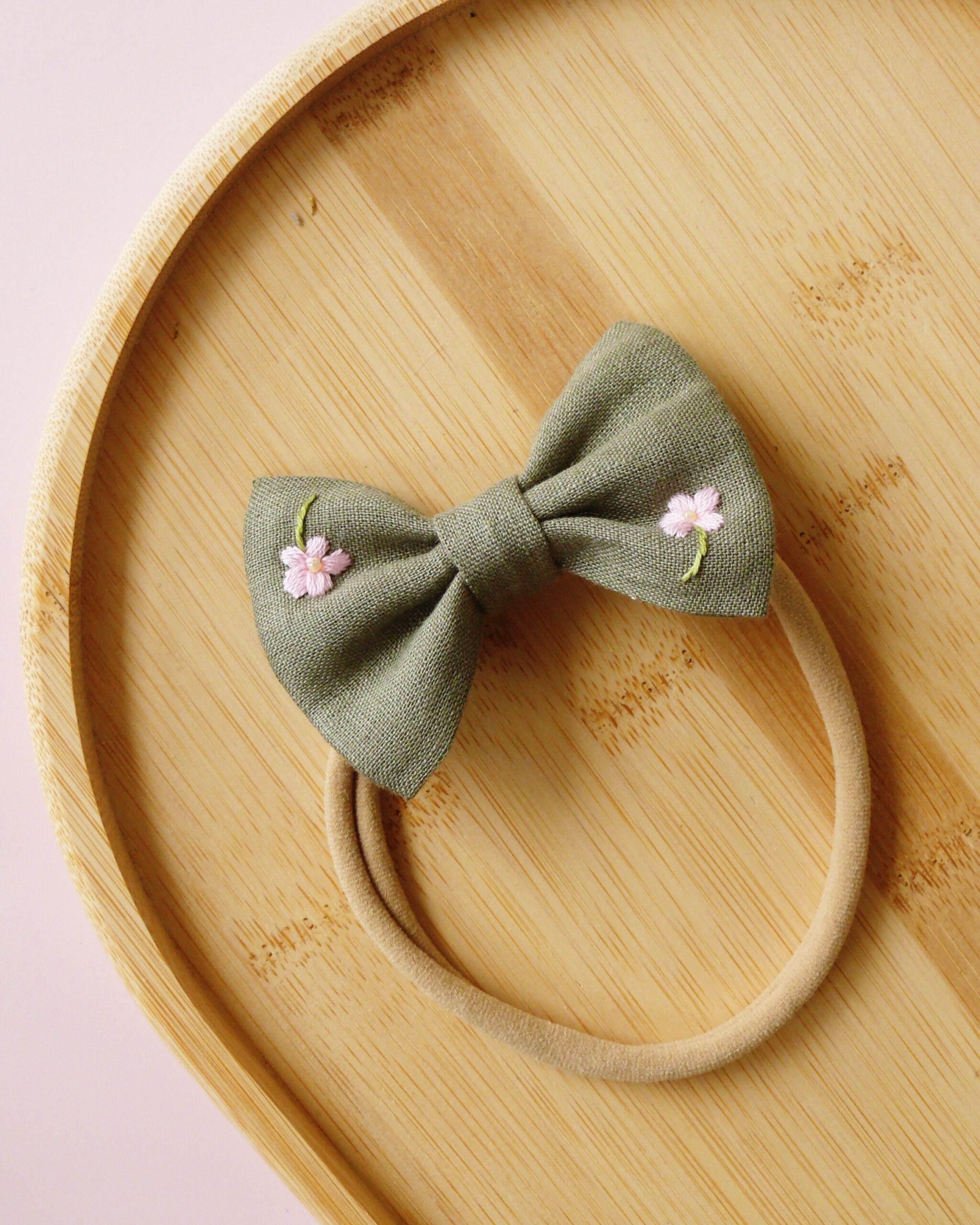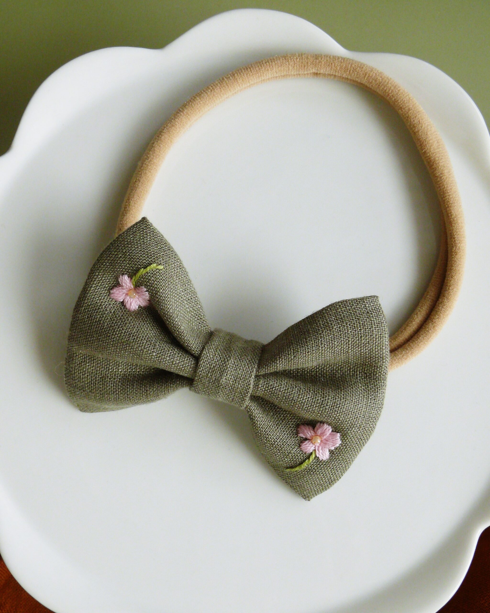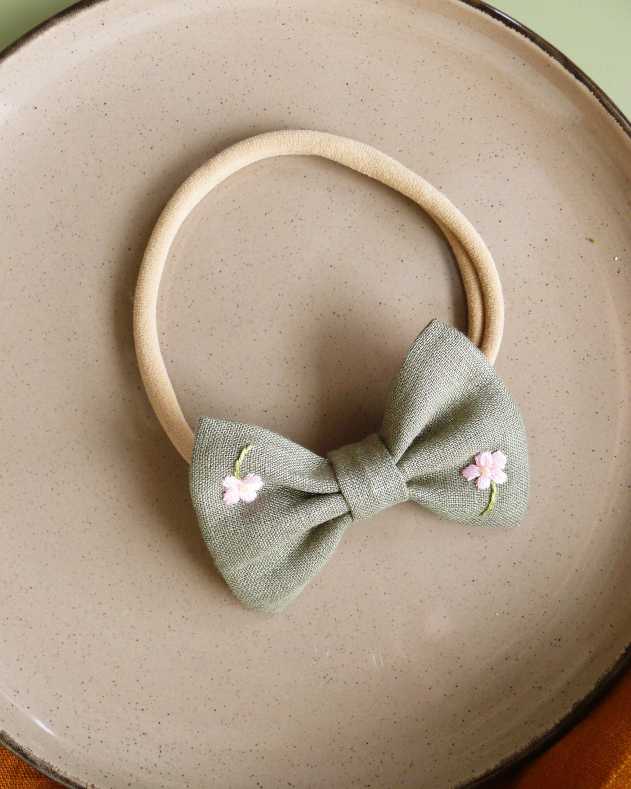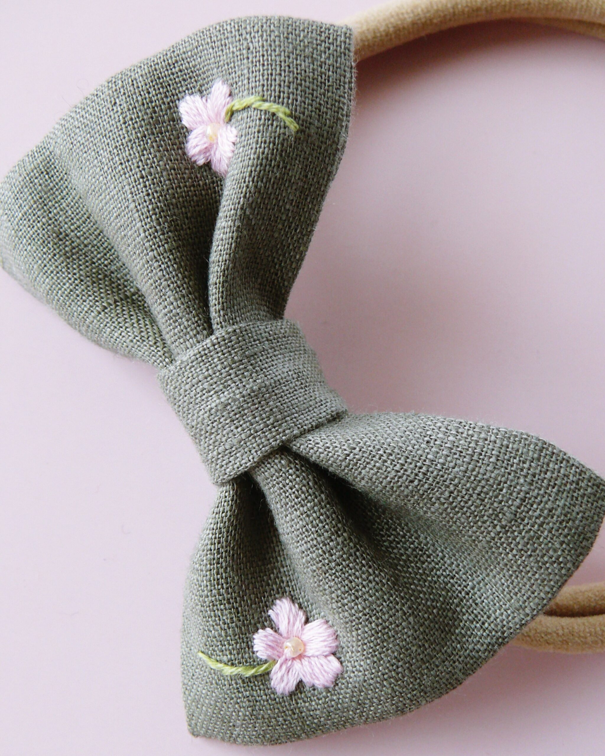 - ręczny haft — każdą kokardę haftuję ręcznie, dlatego wzór jest precyzyjny i trwały.