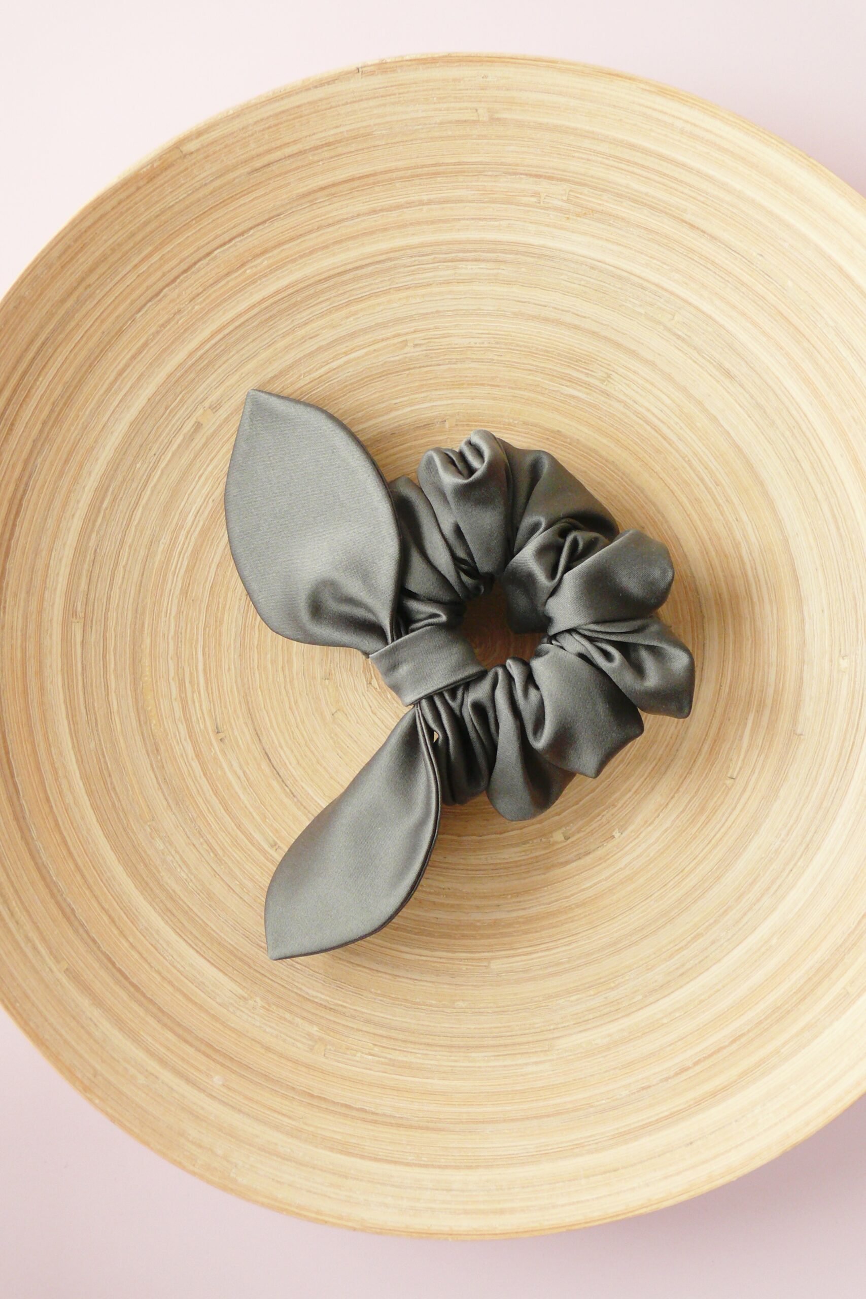 Nasza scrunchie to gumka, która naprawdę dba o włosy. Dlatego uszyliśmy ją z satyny – gładkiego materiału, który nie ciągnie i nie łamie kosmyków. Trzyma włosy w upięciu pewnie, ale delikatnie. Dodatkowo nie ma żadnych metalowych elementów, które mogłyby niszczyć Twoje włosy. Scrunchie ozdobiona jest uszkami, które nie są przymocowane na stałe. Można je odwiązać od gumki i nosić jak twilly, np przypięte do torebki.