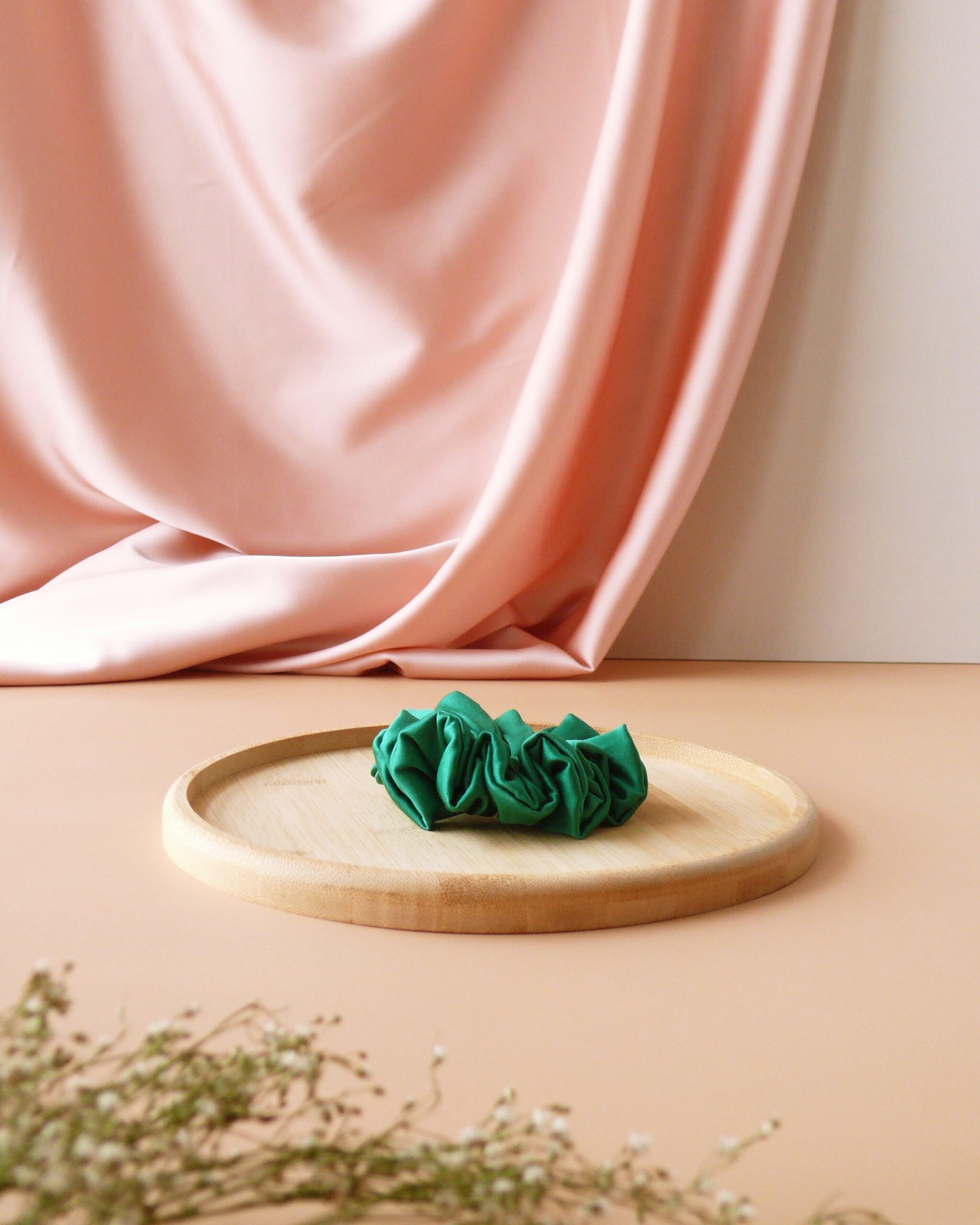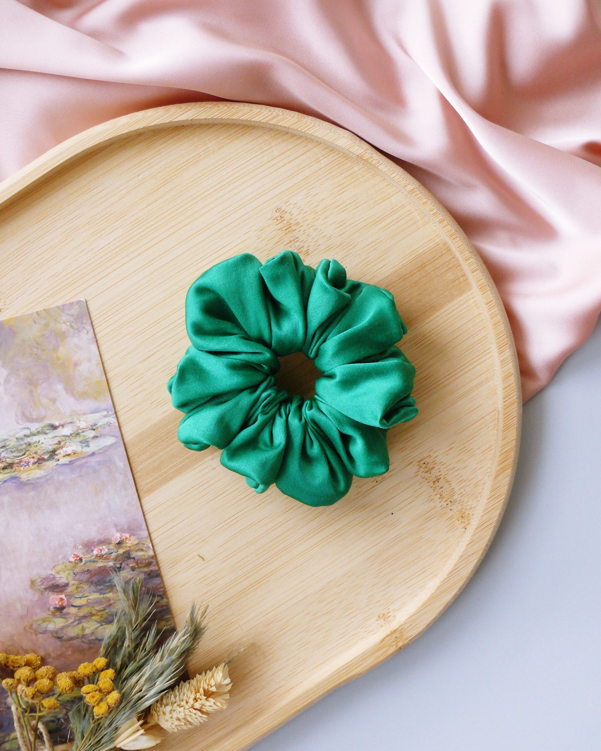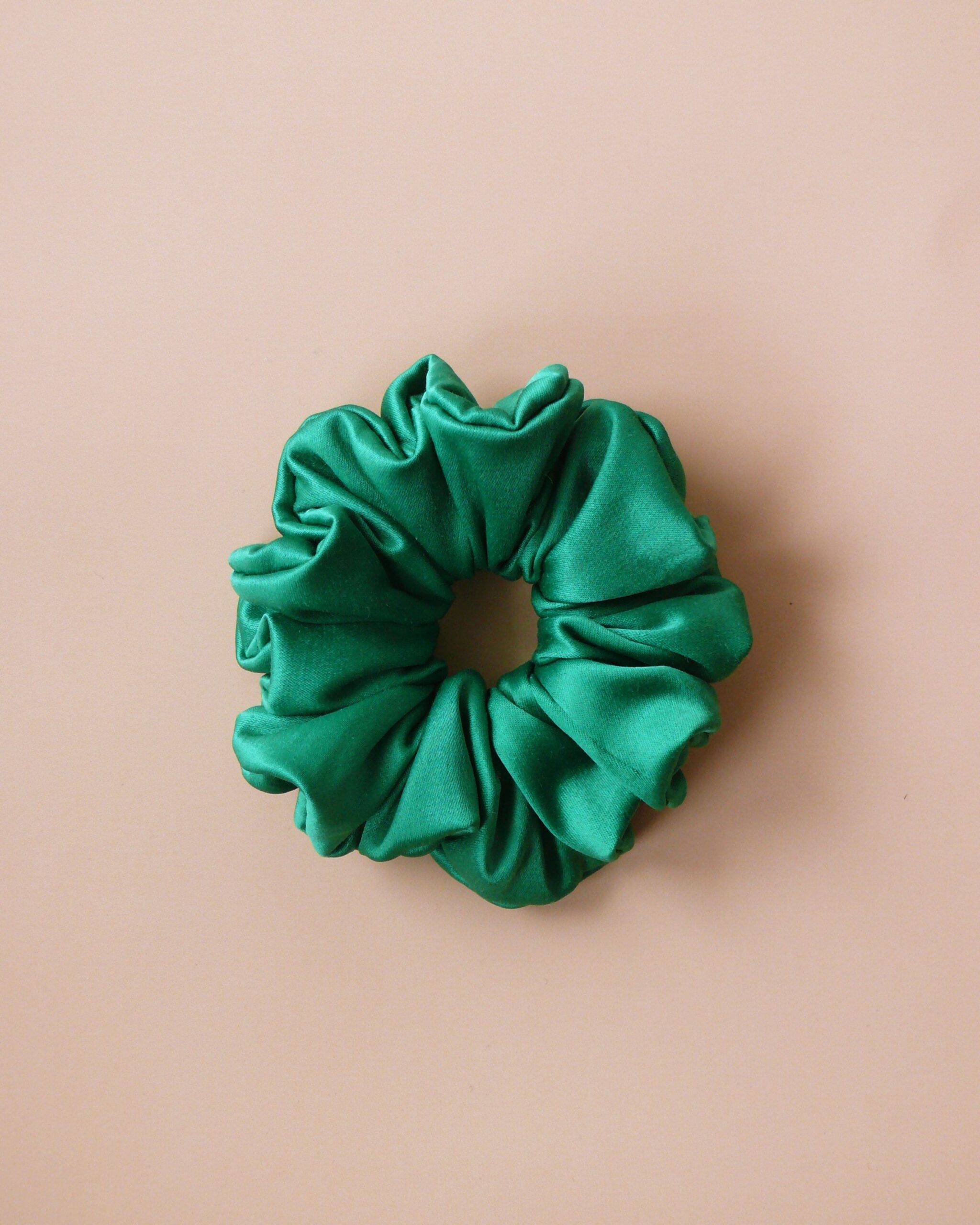 Satynowa gumka do włosów w kolorze zielonym. Miękka i gładka – nie ciągnie, nie łamie kosmyków ani nie pozostawia zagnieceń. Bez metalowych elementów. Szyta ręcznie w Polsce.