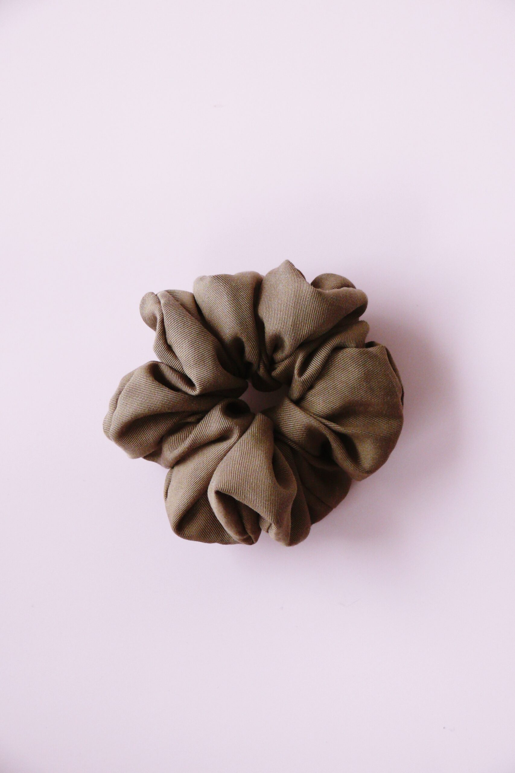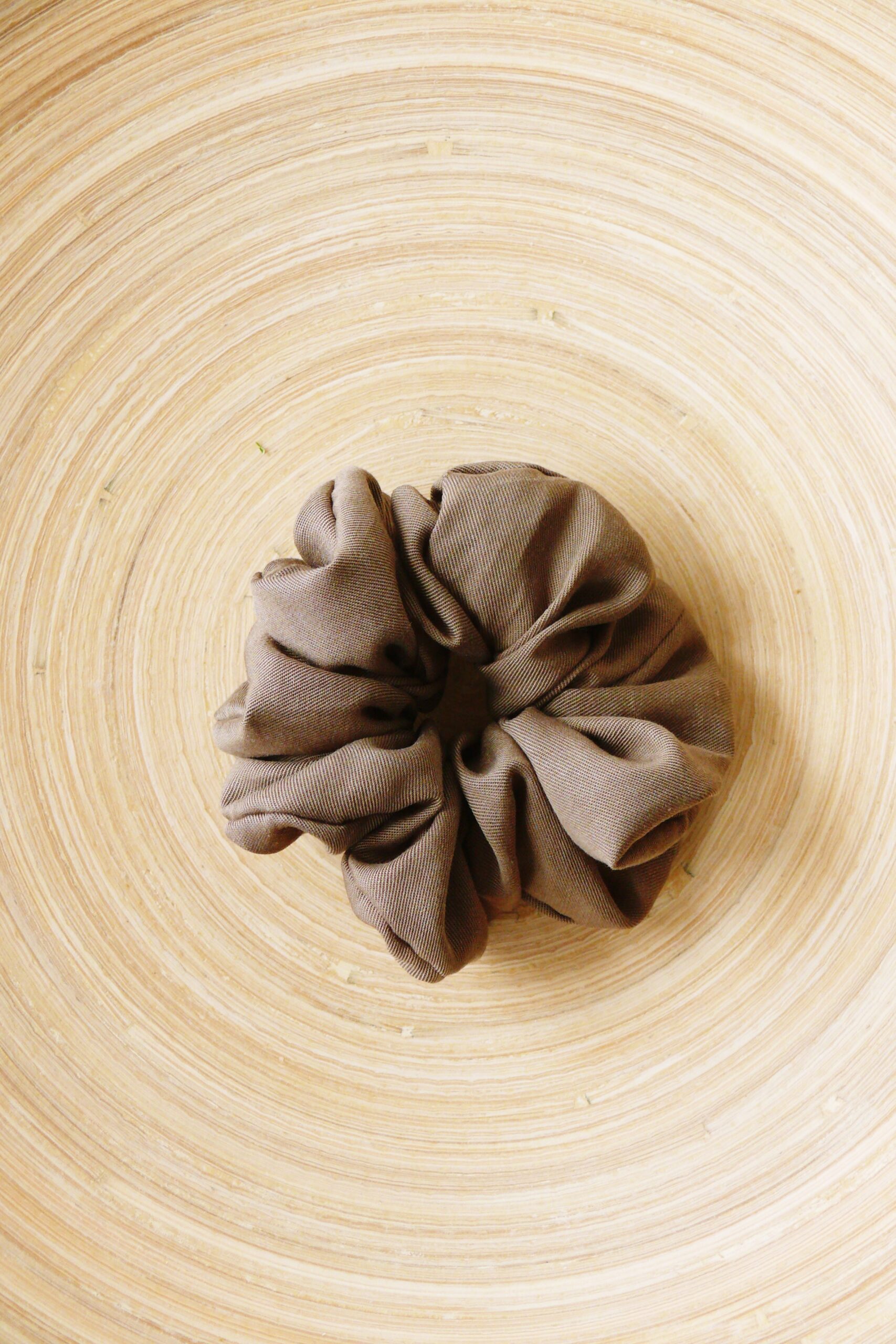 Scrunchie z tencelu to szyta w Polsce gumka do włosów z materiału naturalnego pochodzenia w kolorze khaki.
