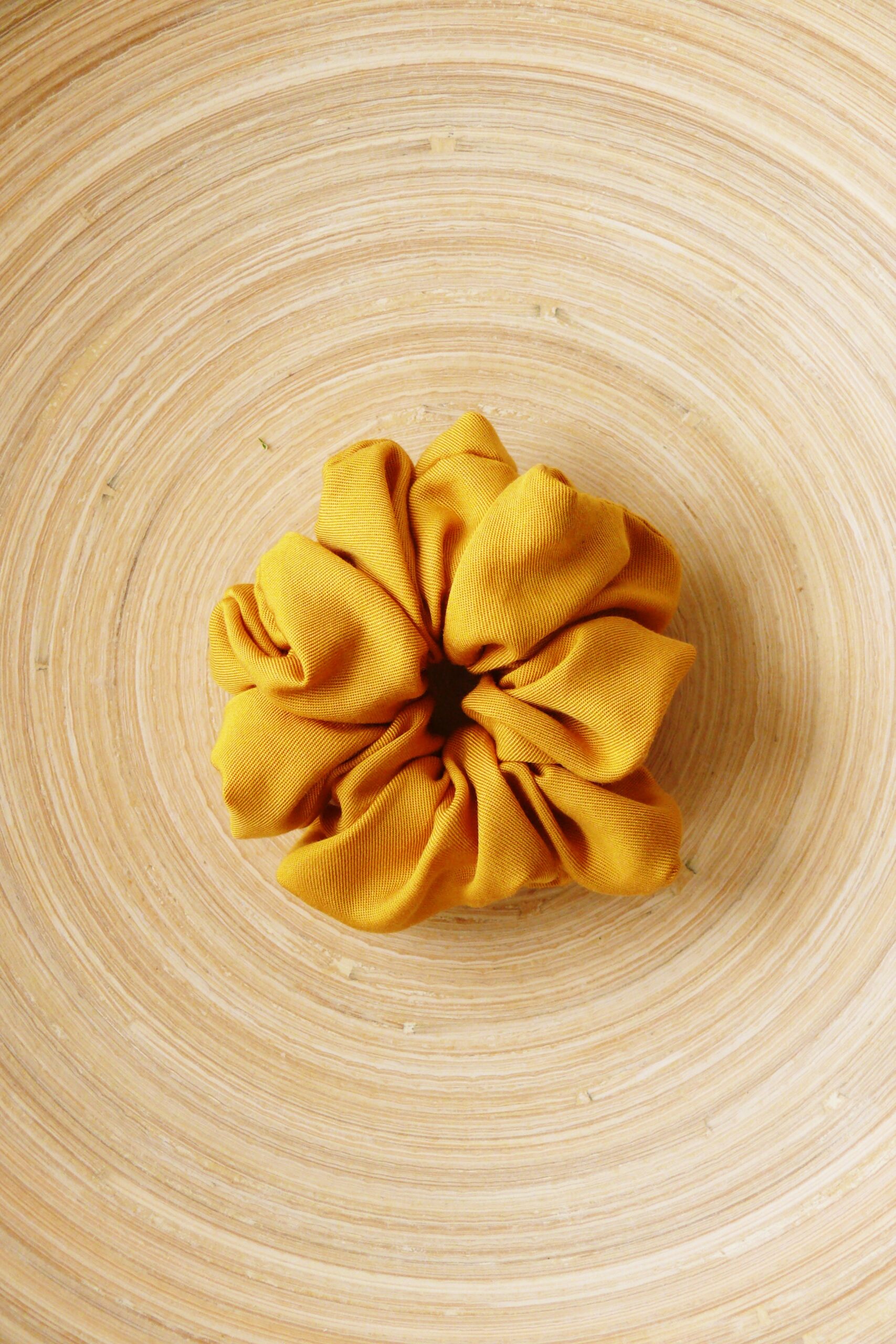 Scrunchie z tencelu to szyta w Polsce gumka do włosów z materiału naturalnego pochodzenia w kolorze musztardowym.