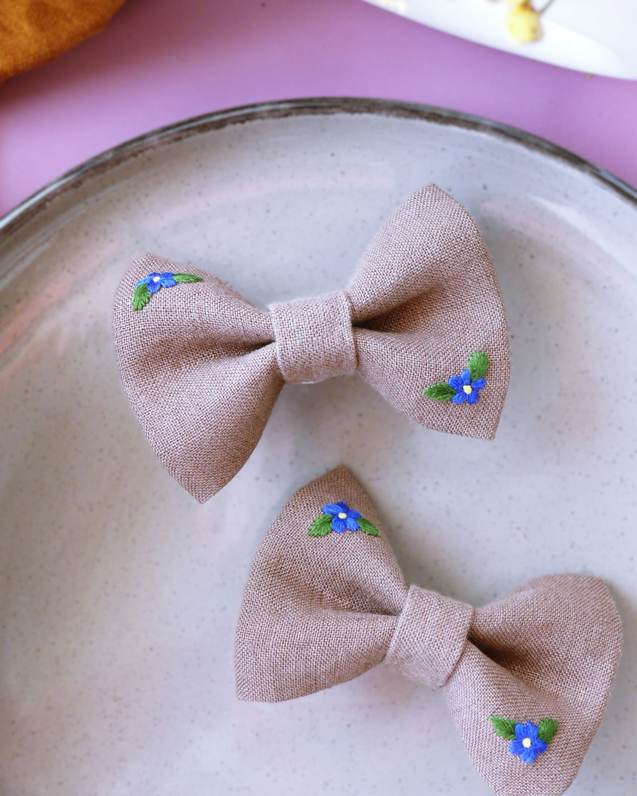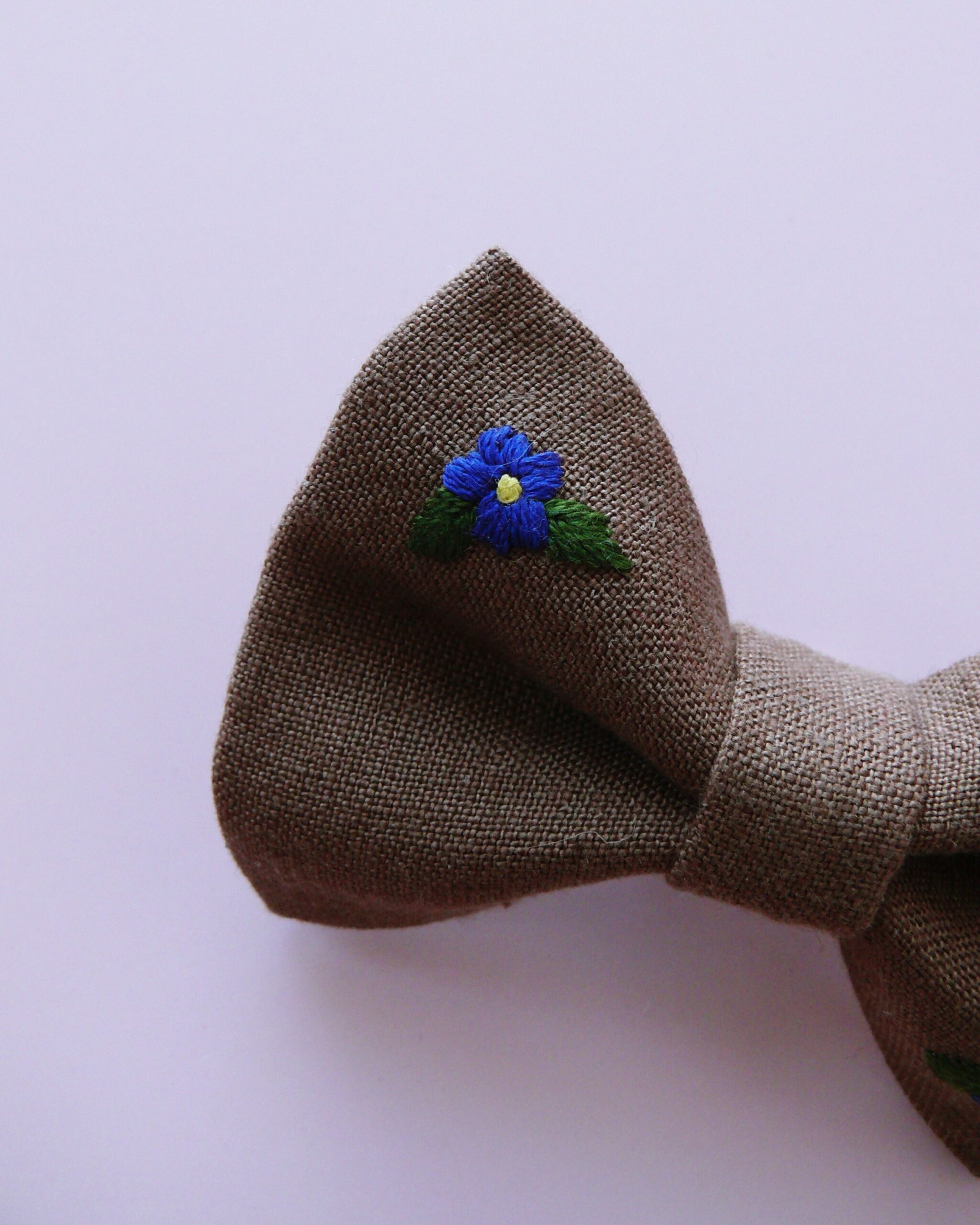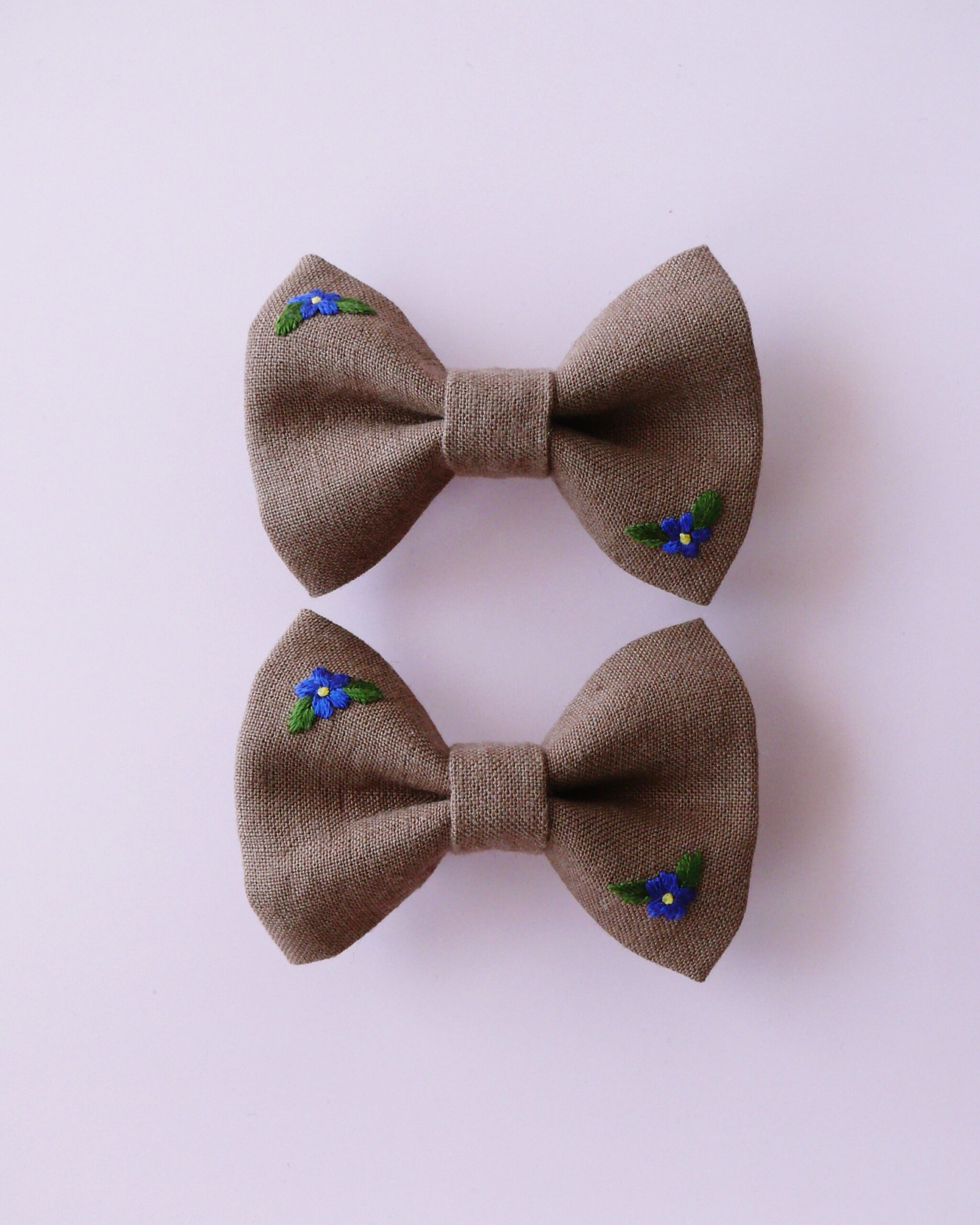 Szukasz spinek, które nie zniszczą się po jednym sezonie? Spinki do włosów z kokardą są inne, ponieważ uszyłam je z lnu. To trwały materiał, który sprawdza się w codziennym użytkowaniu od dekad. Kokardy ozdobiłam haftem w całości wykonanym ręcznie. To nie jest ozdoba do włosów produkowana masowo. Klasyczna, symetryczna forma kokardy sprawia, że to dodatek ponadczasowy. To wybór na lata, a nie sezonowy, przemijający trend.