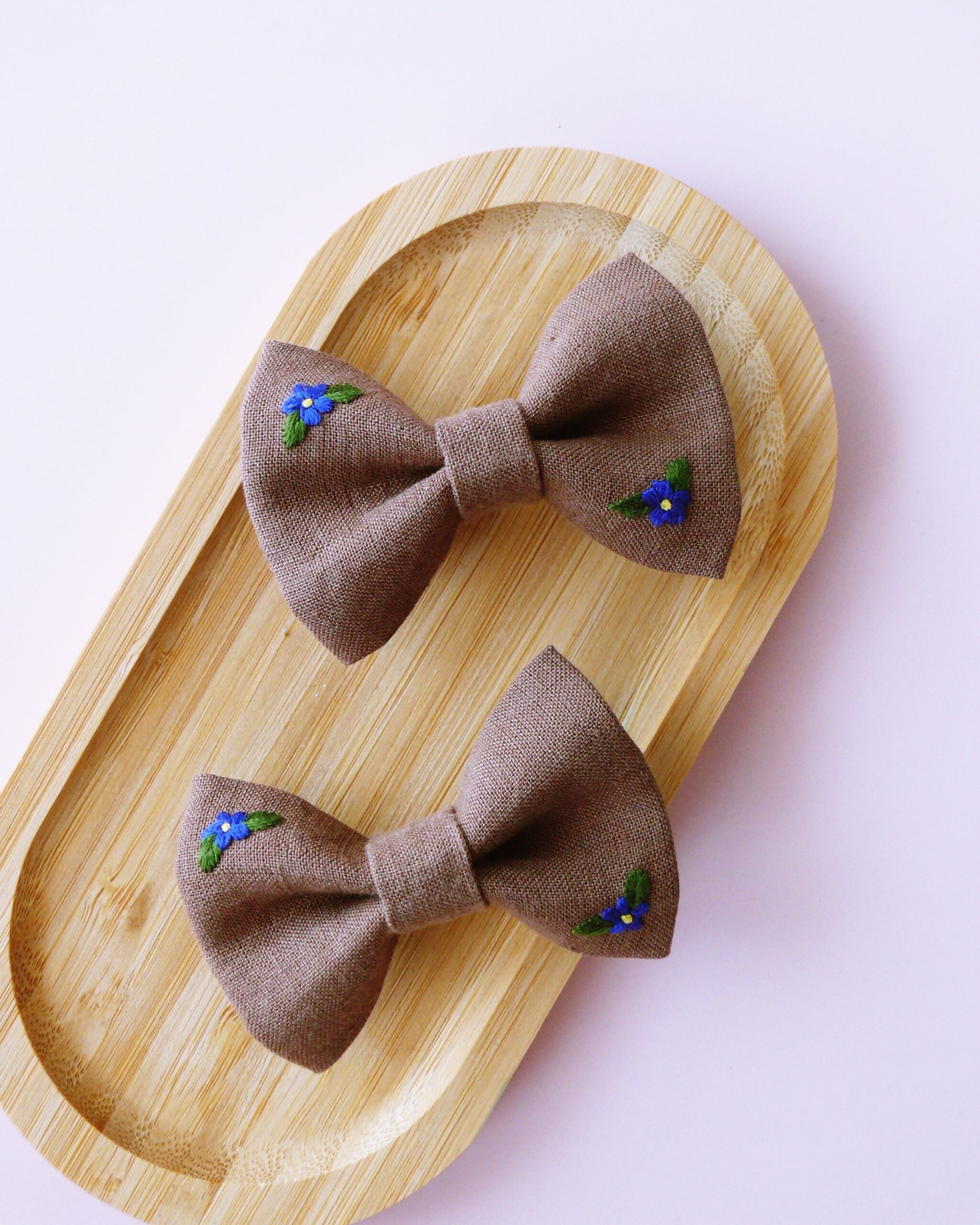 Zestaw dwóch spinek do włosów z lnianymi kokardkami z 100% lnu z certyfikatem OEKO-TEX, szyte w Polsce, ręcznie haftowane.
